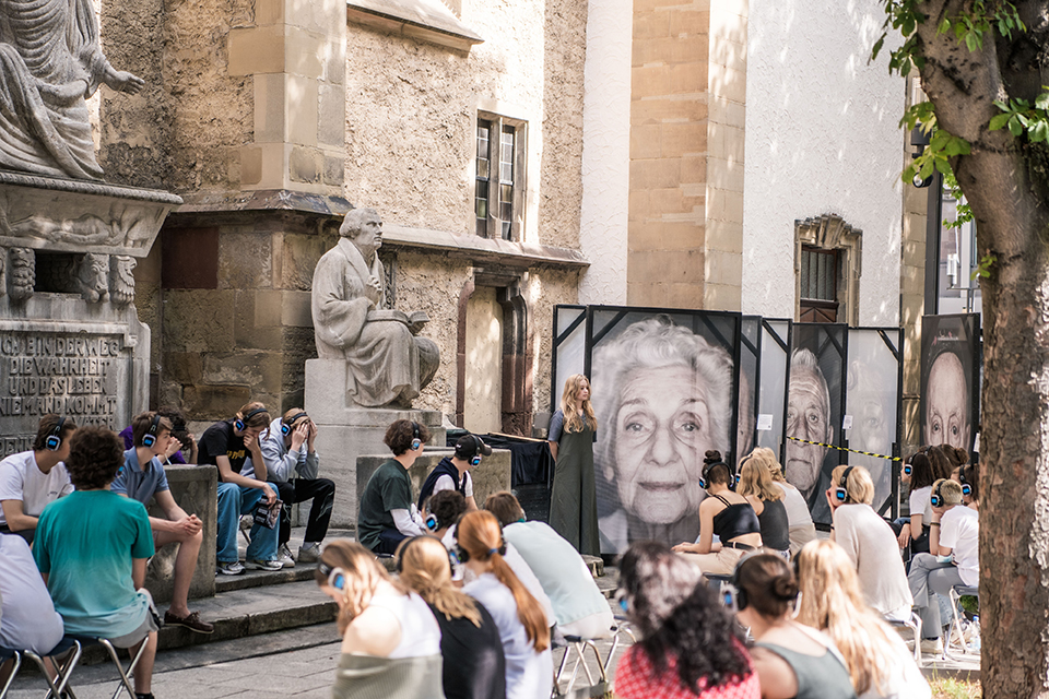In einem Format nähern sich jugendliche Spieler*innen den lebensgroßen Portraits der Holocaust-Überlebenden an. Nach den Vorstellungen von Jugendlichen für Jugendliche kommen die Gruppen ins Gespräch und können sich austauschen. Die Vorstellung wird an der Kaufmännischen Schule Nord Stuttgart gezeigt.